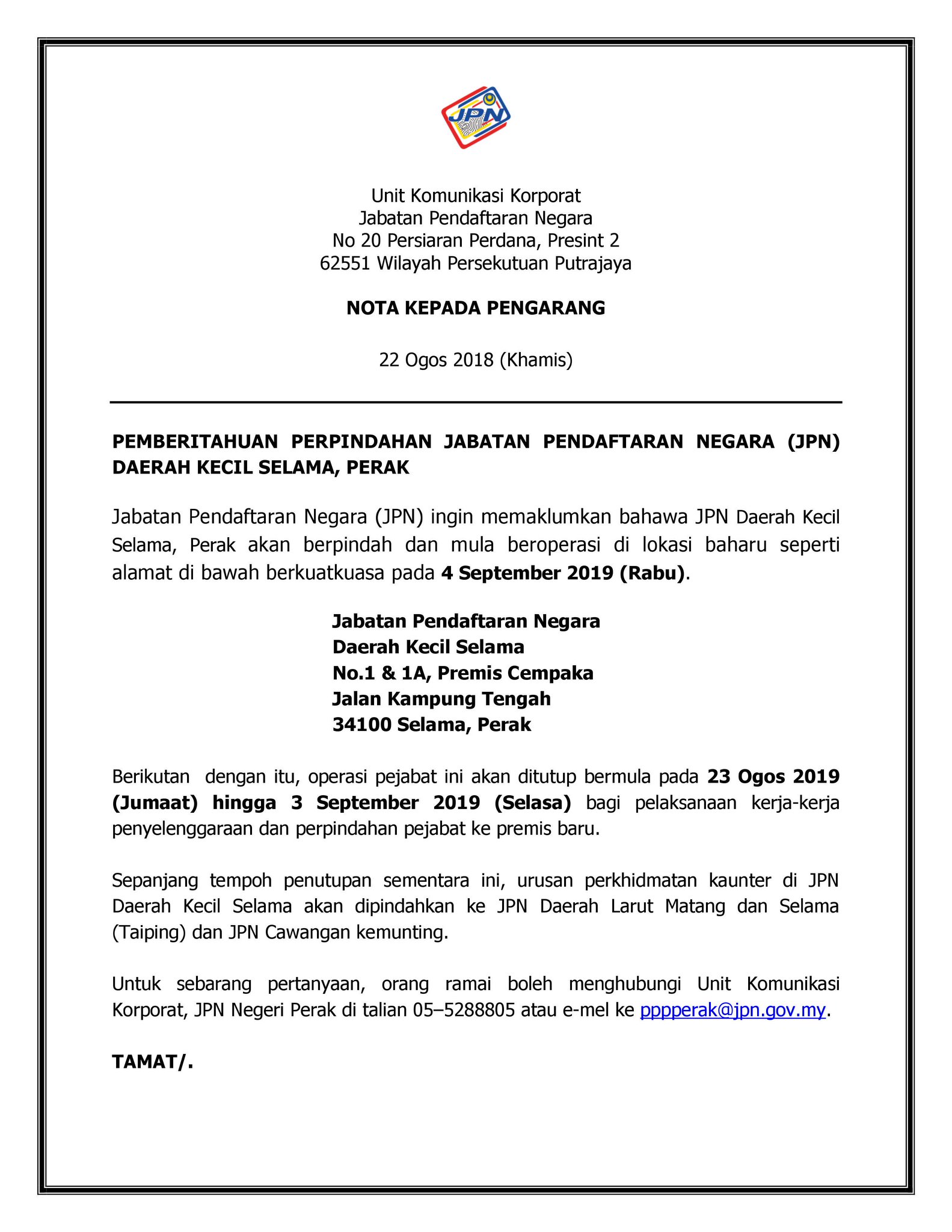 Jpn Malaysia On Twitter Pemberitahuan Perpindahan Jabatan Pendaftaran Negara Jpn Daerah Kecil Selama Perak