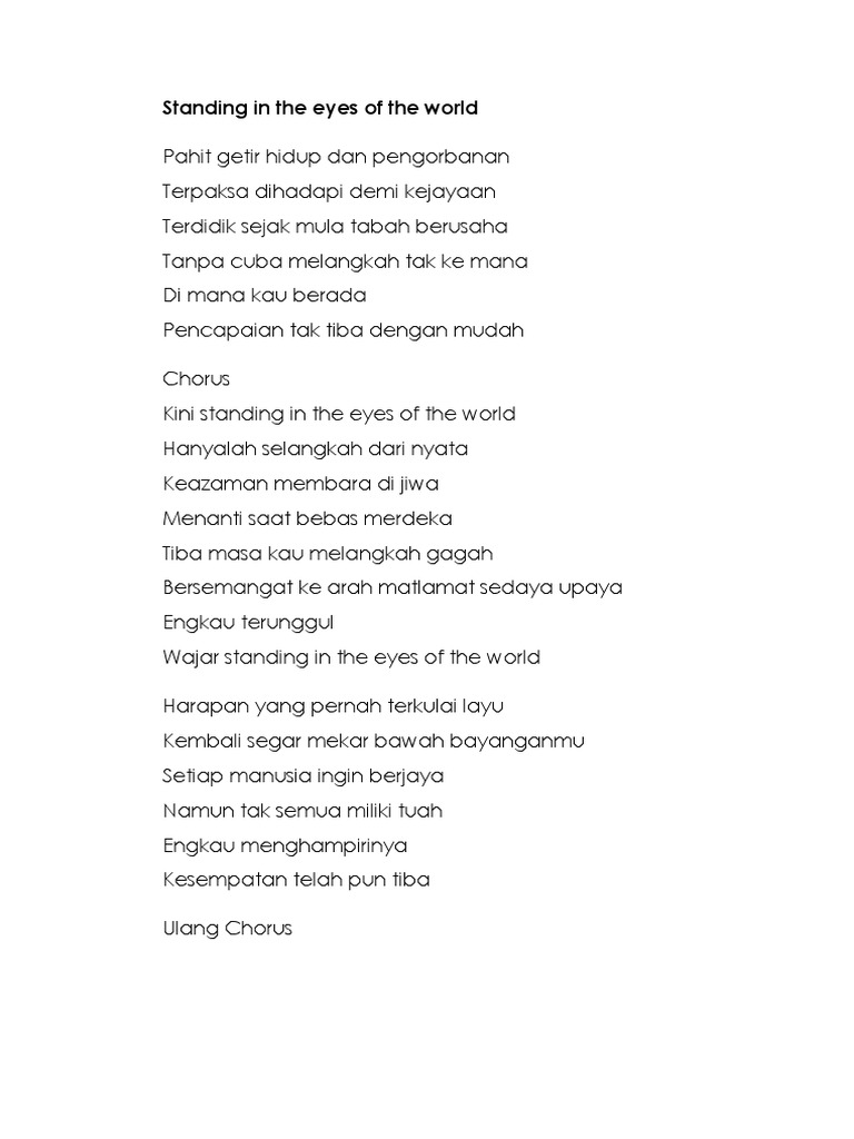 Kini standing in the eyes of the world lyrics. Kini standing in the eyes of the world hanyalah selangkah dari nyata keazaman membara dijiwa menanti saat bebas merdeka tiba masa kau melangkah gagah bersemangat ke arah matlamat sedaya upaya engkau terunggul wajar standing in the eyes of the world harapan yang pernah terkulai layu kembali segar mekar bawah bayanganmu setiap manusia ingin. Kini standing in the eyes of the world hanyalah selangkah dari nyata keazaman membara di jiwa menanti saat bebas merdeka tiba masa kau melangkah gagah bersemangat ke arah matlamat sedaya upaya engkau terunggul wajar standing in the eyes of the world. Watch official video print or download text in pdf.